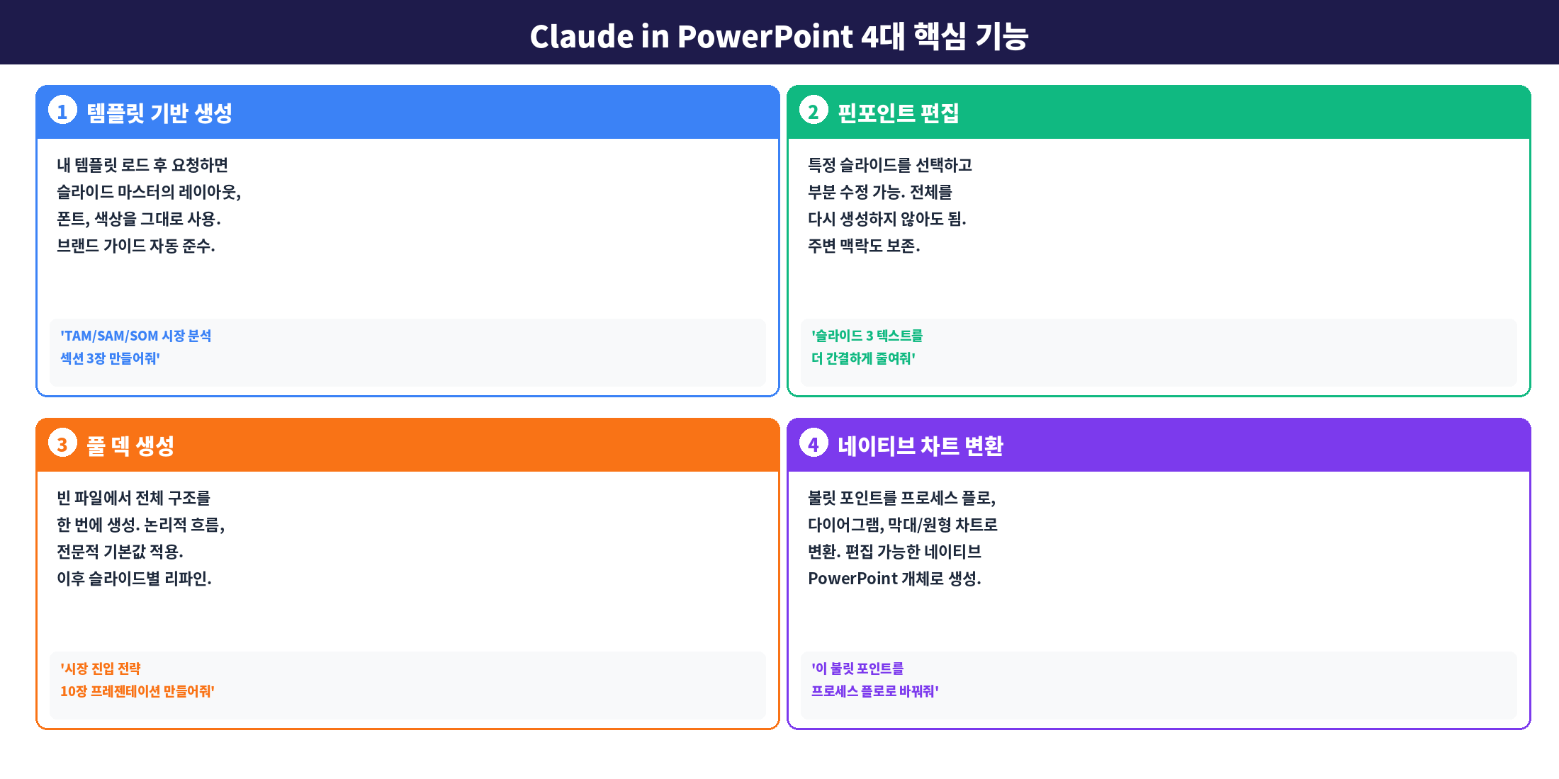 | 3 | Claude in PowerPoint | 슬라이드별 리파인, 차트 추가, 스토리 재구성 |